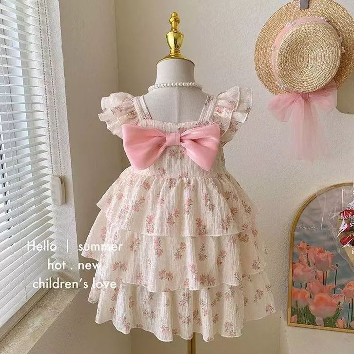 2-9 Th Gaun Putri Bergaya Modern Anak Katun Crinkle Motif Bunga Pink Lengan Puff Pita Besar Rok Mengembang Musim Panas