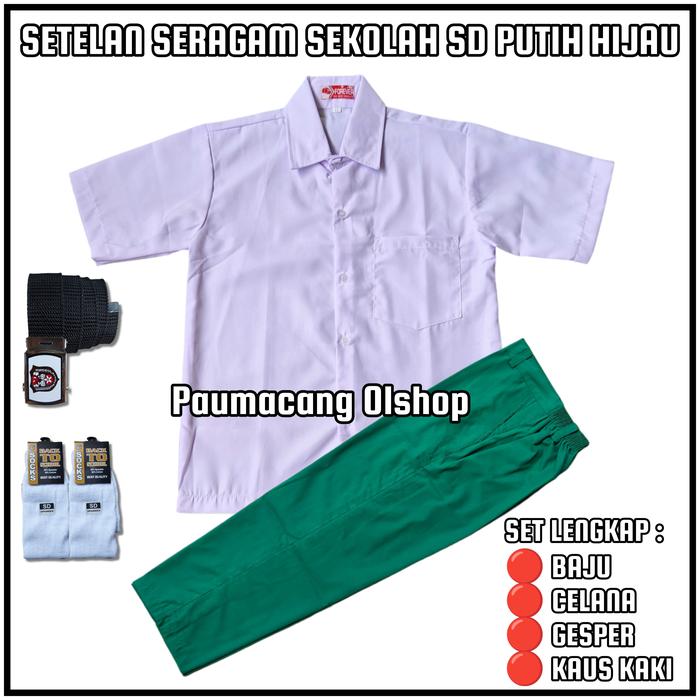 Setelan Seragam Sekolah SD/MI Putih Hijau Anak Putra Baju Putih Polos Lengan Pendek Celana Hijau