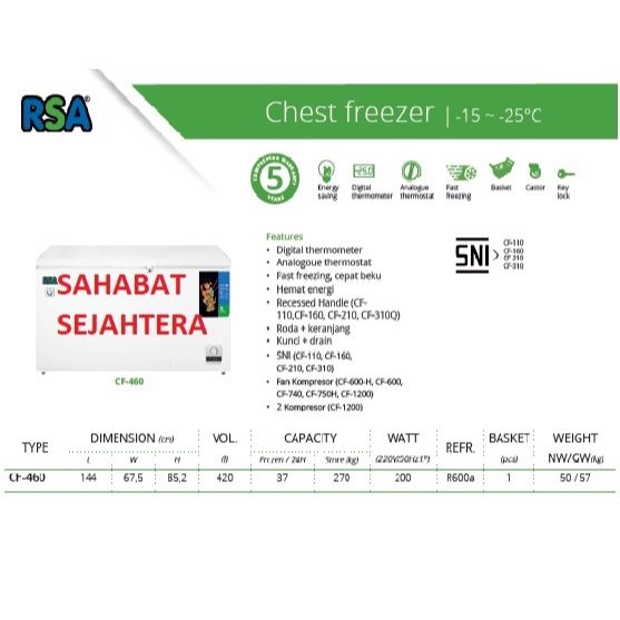 RSA Chest Freezer CF-460 Freezer Box Kapasitas 420 Liter