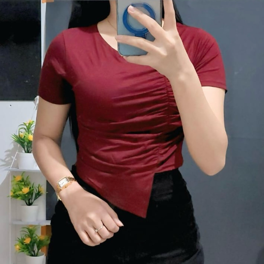 Crop Top Kerut Lengan Pendek Wanita - Crop Shirt V-Neck Asymmetric - Atasan Korean Fashion 6044