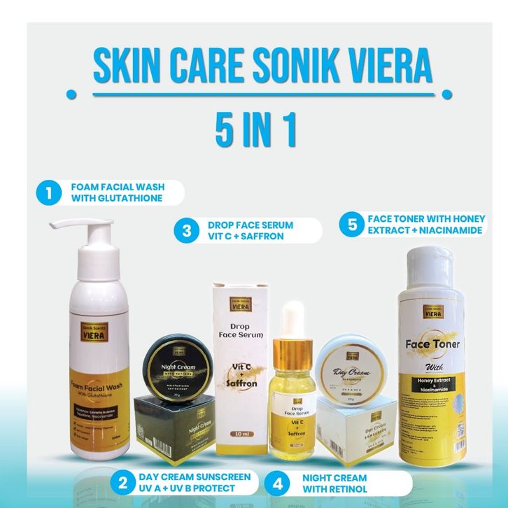Paket 5 in 1 Sonik Viera Perawatan Wajah kering Sonik Viera: Day Cream, Night Cream, Facial Foam,