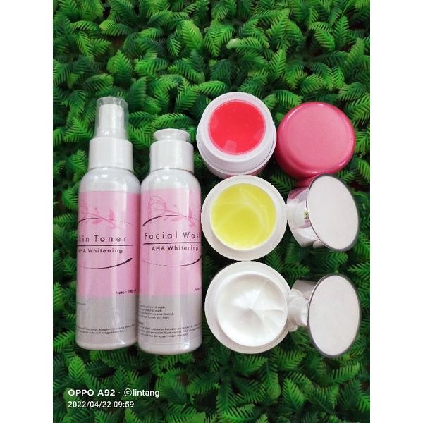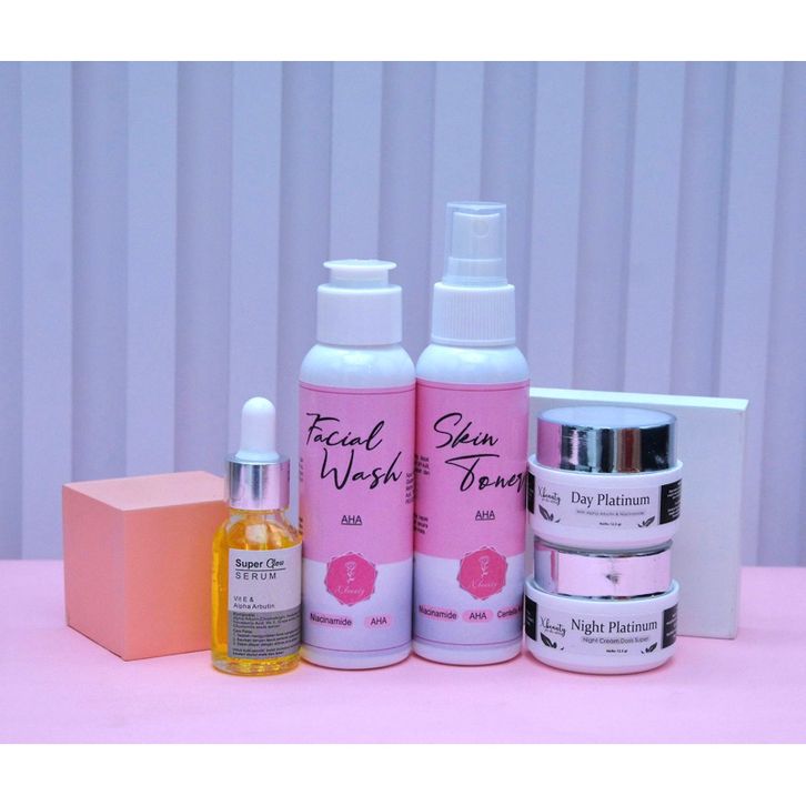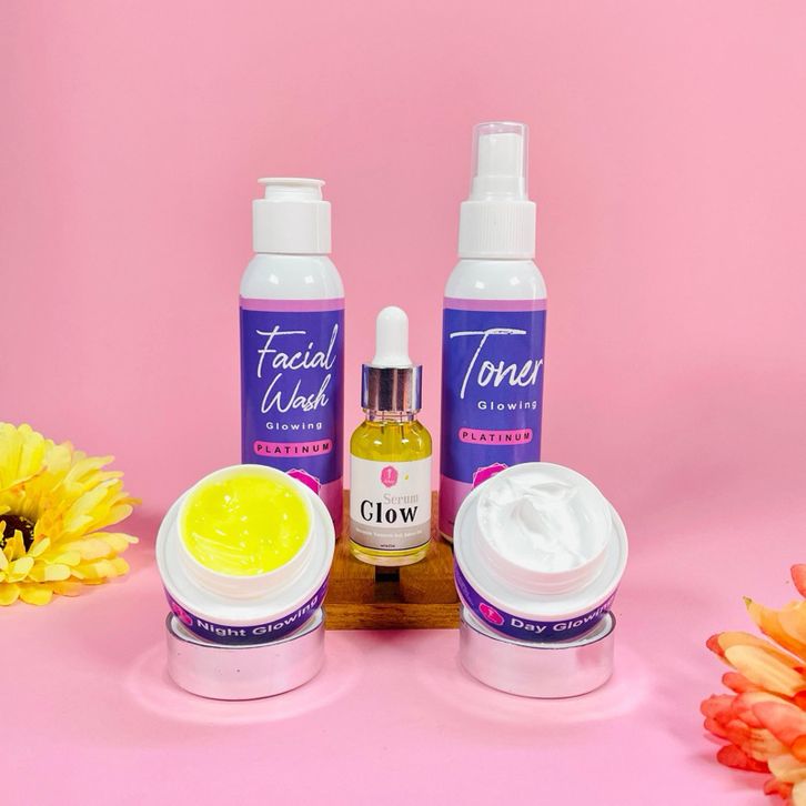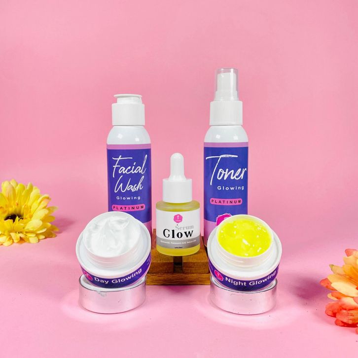 1 pkt day plat, 1 pkt day white, Day cream, Fasial wash, Night cream, Serum, Toner
