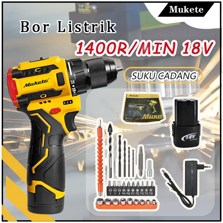 Mukete 1400R/MIN/18V bor impact bor cordless bor impact baterai bor baterai Mesin Cordless Mini Set Screwdriver Obeng