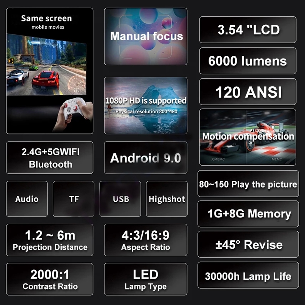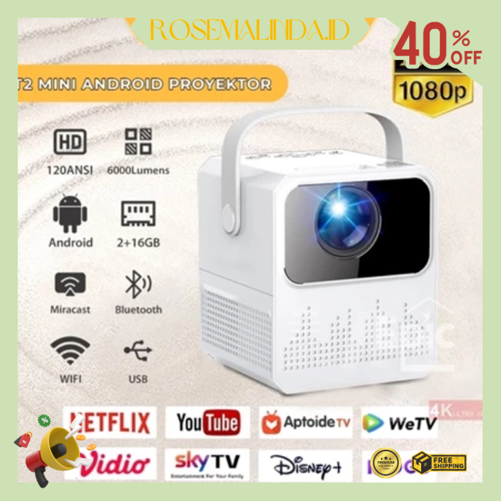 proyektor mini T2mini Proyektor Android TV 1080P Smart Projector 6000 Lumen Android 9.0 Ram 2G Rom 16G proyektor mini