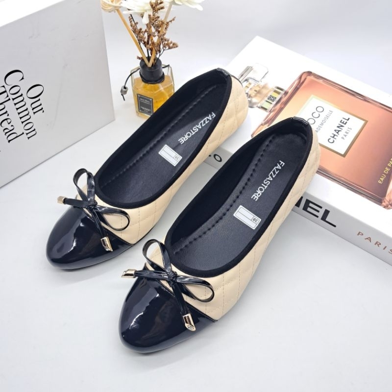 (Gratis Ongkir) Fazzastore Sepatu Flatshoes Wanita Natalia Karet Motip Tali Pita Depan B-001 Sepatu Kerja Anti Slip