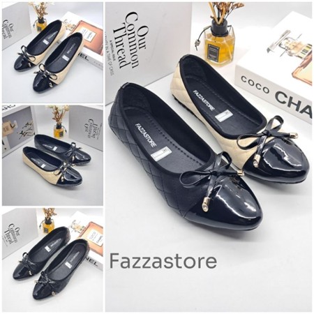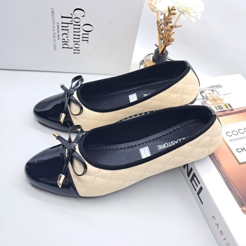 (Gratis Ongkir) Fazzastore Sepatu Flatshoes Wanita Natalia Karet Motip Tali Pita Depan B-001 Sepatu Kerja Anti Slip
