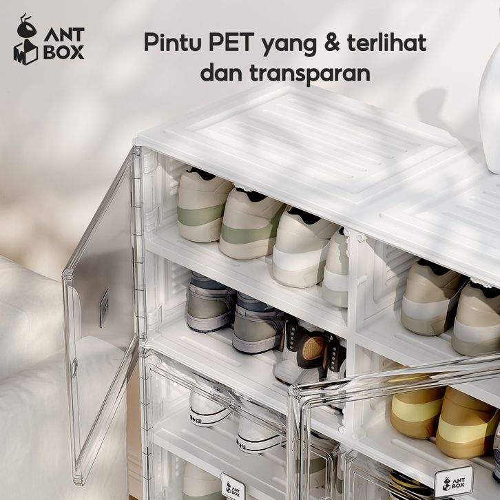 ANTBOX Kabinet Sepatu Rangka Putih Transparan Kapasitas 32 Pasang Rak Susun Minimalis Anti Debu