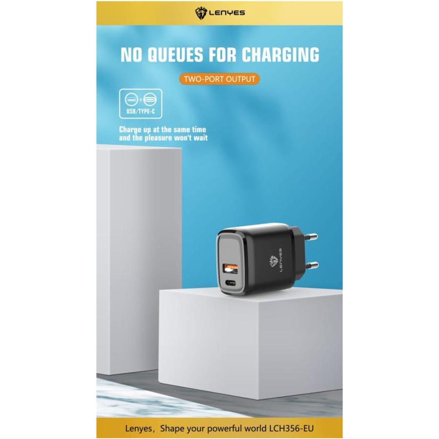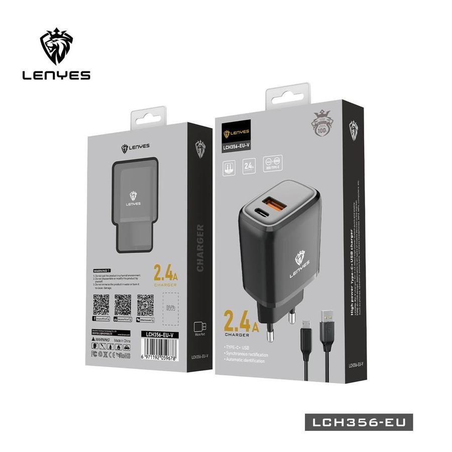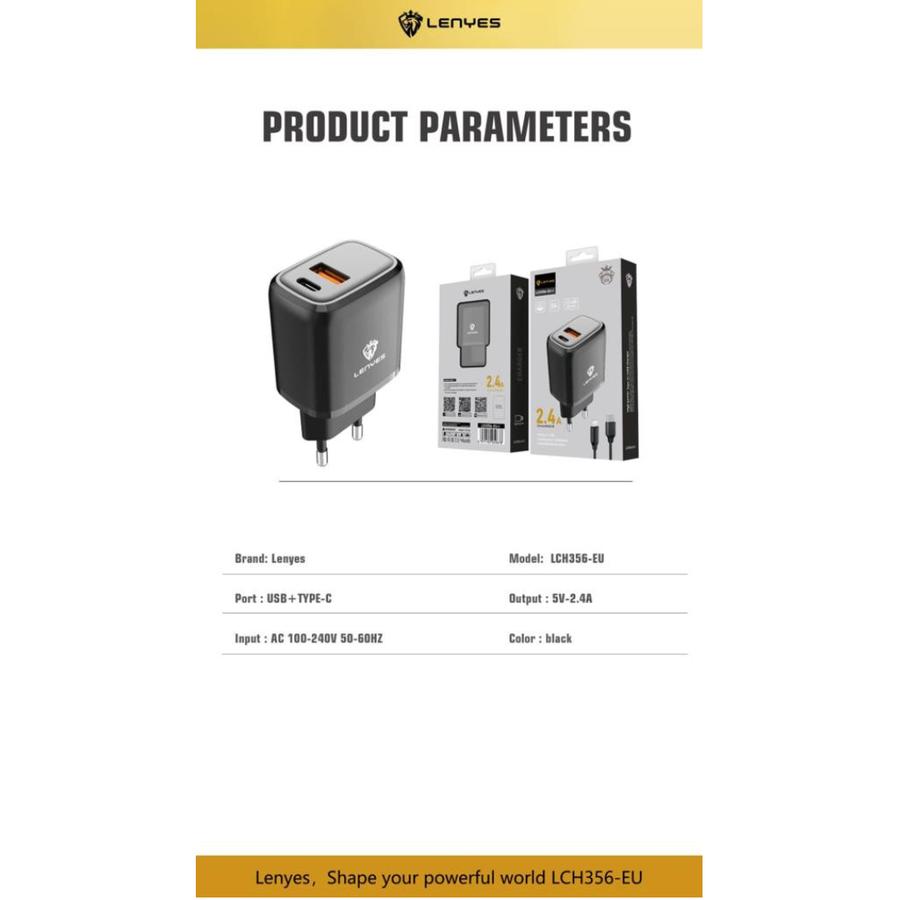 Charger HP LENYES LCH356EU 2.4A USB + Type C Adaptor + Kabel Casan Handphone Android Ios Original Official Store