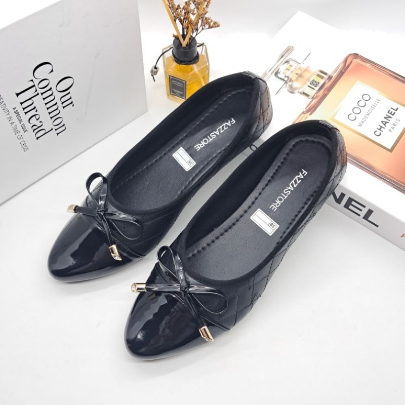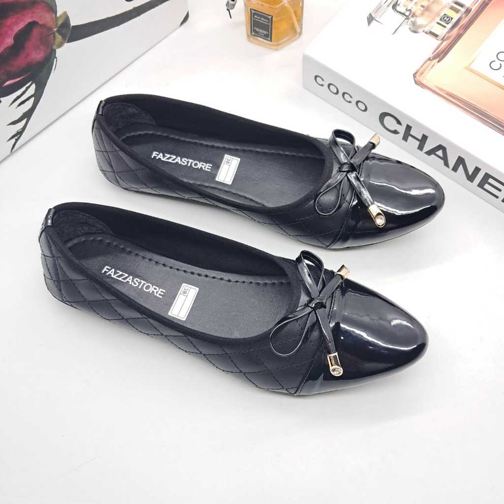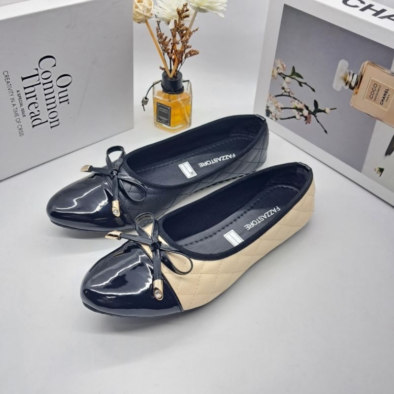 (Gratis Ongkir) Fazzastore Sepatu Flatshoes Wanita Natalia Karet Motip Tali Pita Depan B-001 Sepatu Kerja Anti Slip