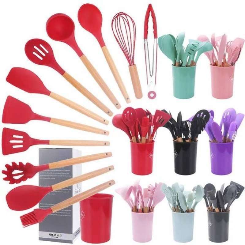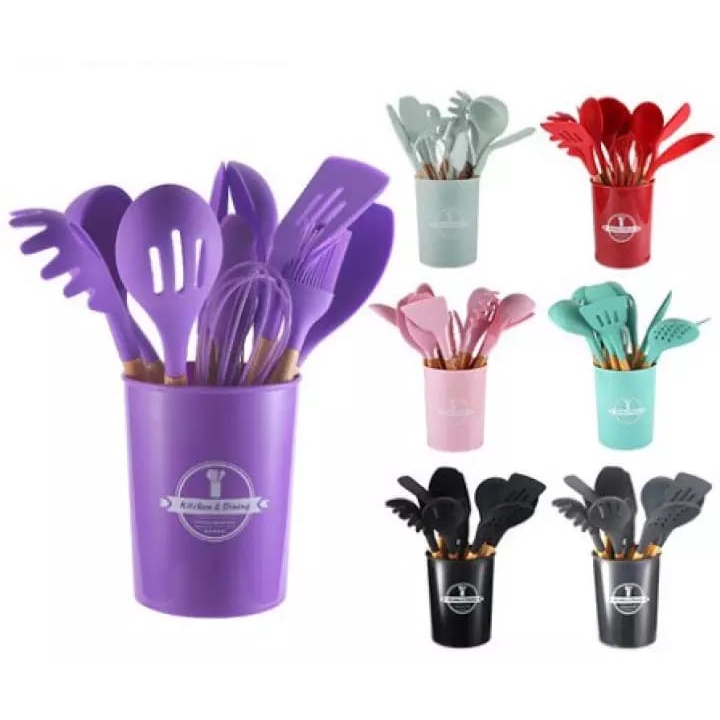 spatula set silikon 12 in 1 SET Silicone Kitchen Set Utensil Spatula Cooking BPA Free - Alat Masak Dapur Silikon Gagang