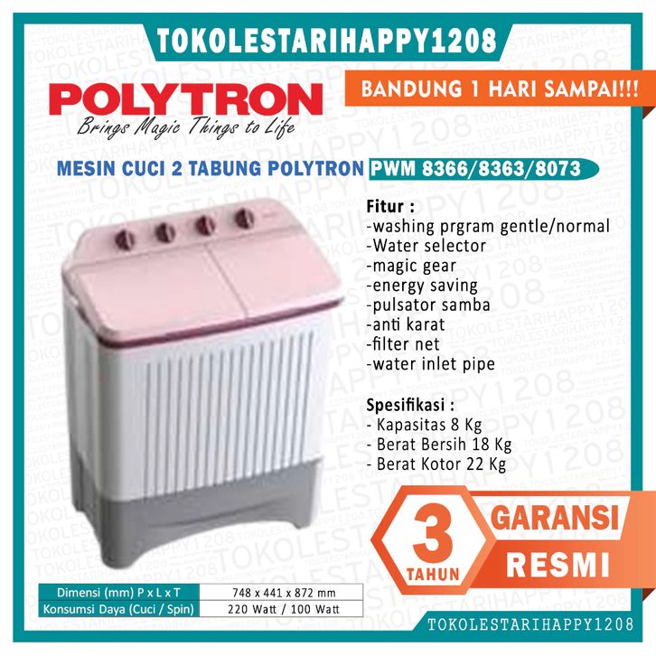 MESIN CUCI 2 TABUNG POLYTRON PWM 8366/8363/8073 MURAH GARANSI RESMI 1 TAHUN FREE ONGKIR