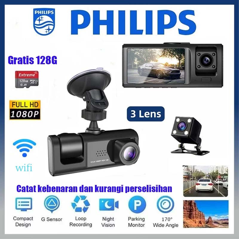 PHILIPS GRATIS 128GB 2K PEREKAMAN VIDEO DASHCAM MOBIL 3 CAMERAS KAMERA MOBIL 24 JAM READY STOCK NIGHT VISION WIFI DAN GPS MULTIFUNGSI DASHCAM GARANSI 3 TAHUN