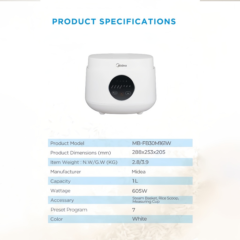 【Free Gift】Midea Magic Com Mini 1L MB-FB30M161W - Rice Cooker Digital 7 Menu, Cocok untuk 1-3 Orang