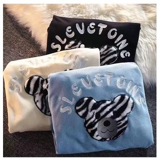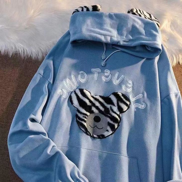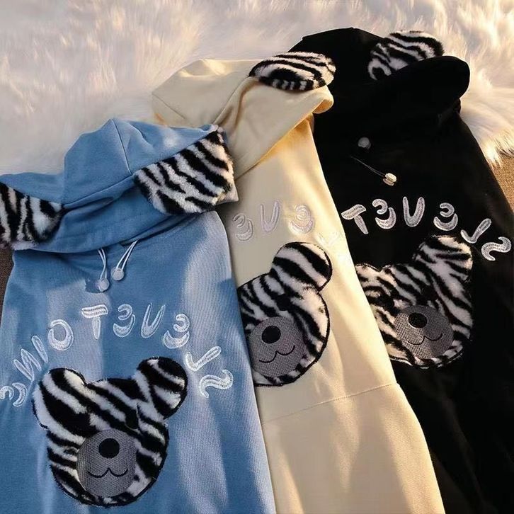 littlecrab Hoodie Oversize Ber. Motif Warna Zebra Telinga Hitam Putih Lucu Cute Black White Bear Hoodie Bordir Lucu