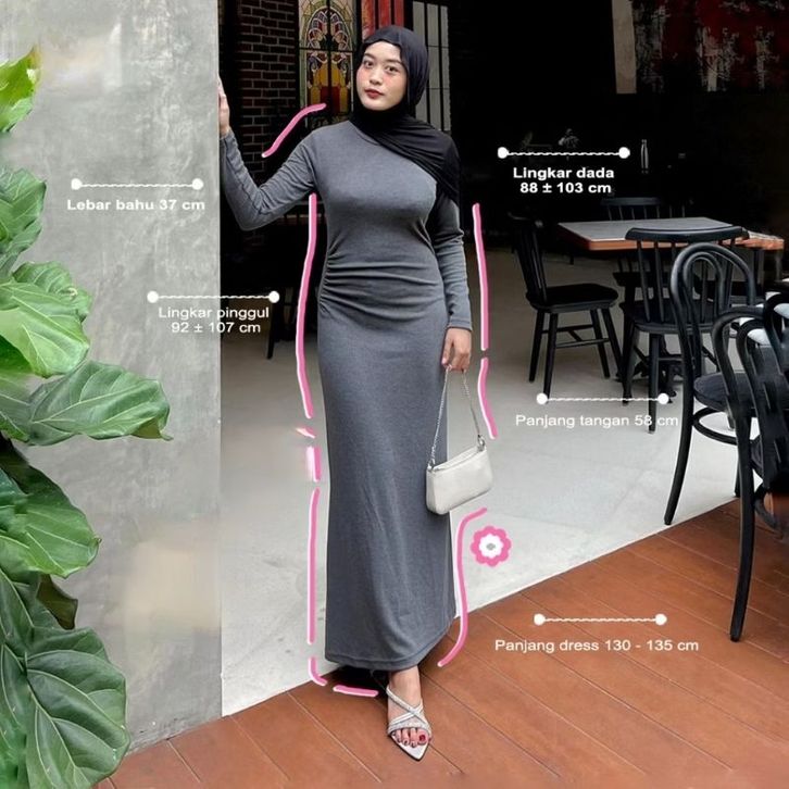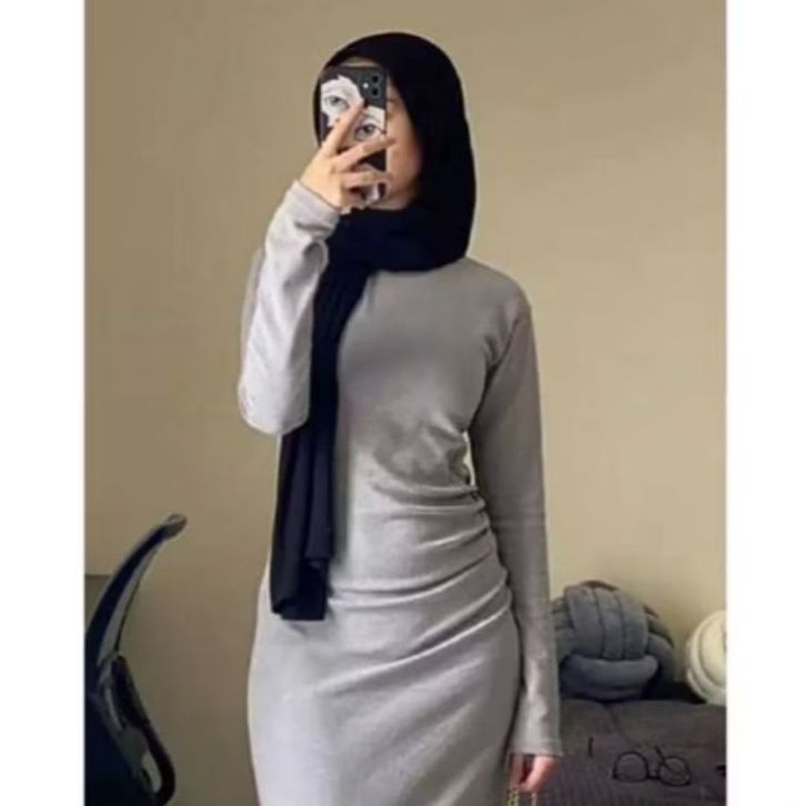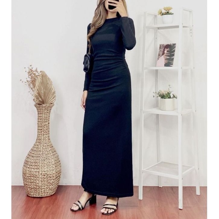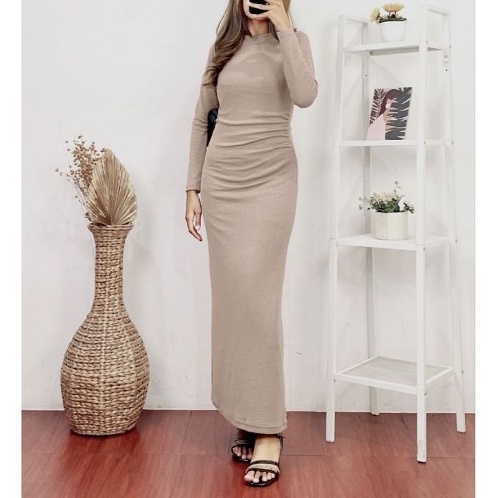 Lea Basic Knit Dress Press Body Kerut Samping Baju Body Fit Wanita Lengan Panjang Dress Wanita Sexy Kekinian