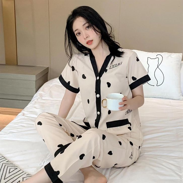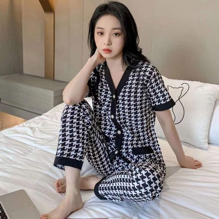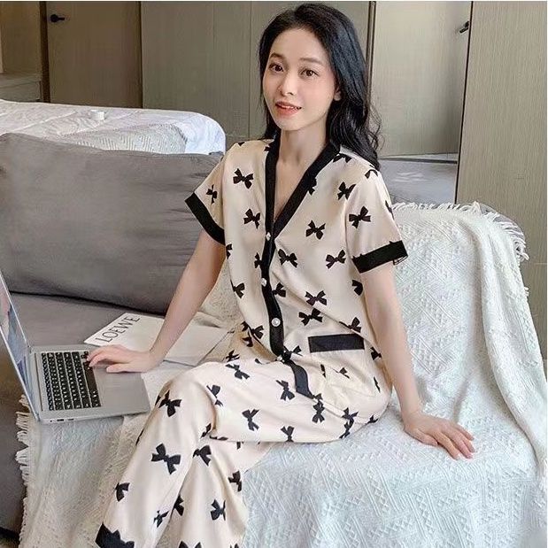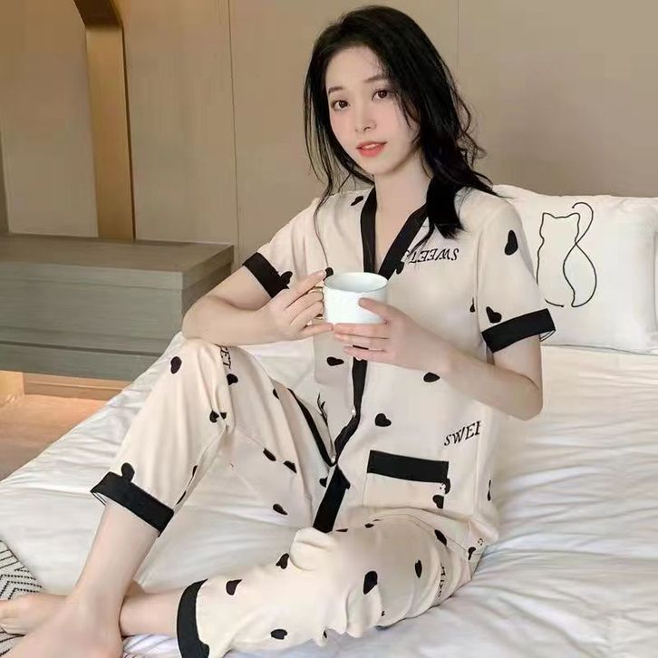 GRATIS ONGKIR Baru musim panas es sutra piyama wanita atasan lengan pendek + celana setelan homewear