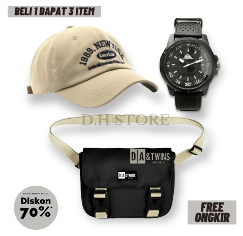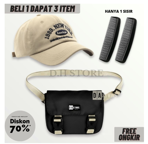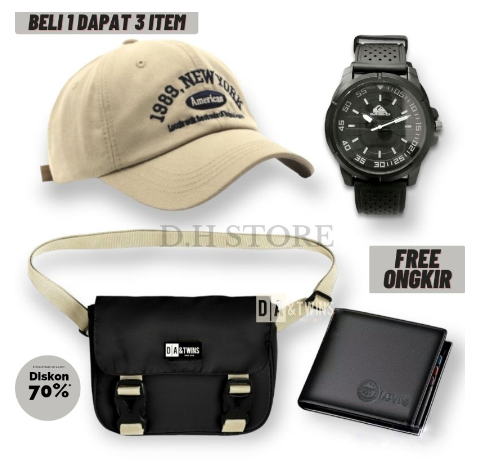 Tas Salempang pria,Paket Bundling 4 in 1 sling bag pria gratis jam topi dan dompet