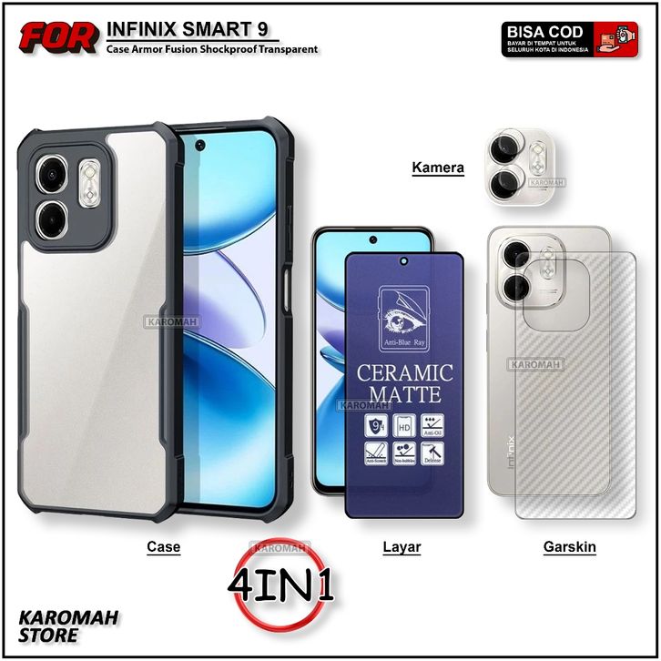 Paket 4in1 Case Infinix Smart 9 Smart 9 HD Tempered Glass Anti Spy Softcase Fusion Armor Shockproof Transparant Black