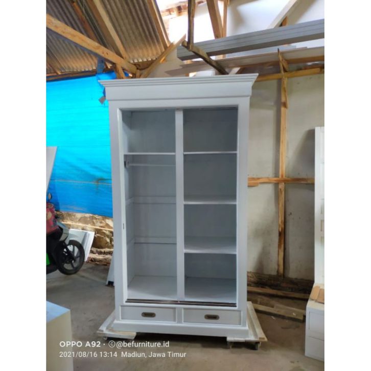 PROMO lemari pakaian sliding 2 pintu putih bahan kayu jati / lemari kayu jati sliding 2 pintu cat putih ORIGINAL