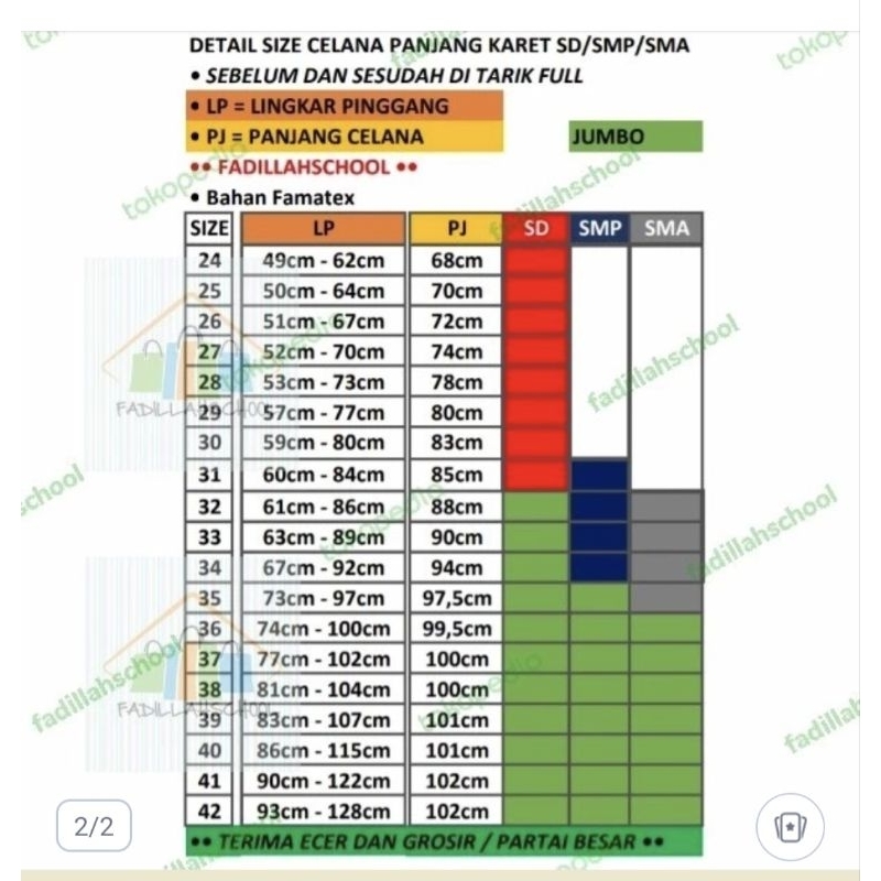 Seragam Sekolah Celana JUMBO SD SMP SMA Panjang Karet Merah Abu Biru Hijau Putih Hitam Pramuka Coklat