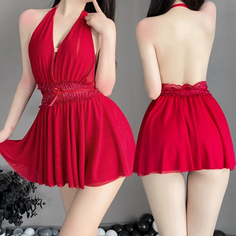 Sexy Lingerie Hot Halter Neck Perspective Renda Dress Baju Tidur Lingerie Set 3A559