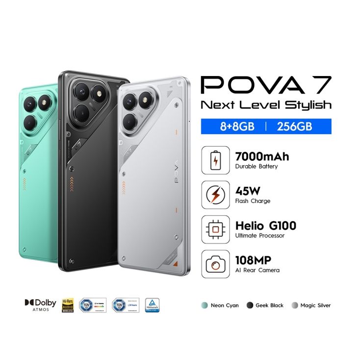 TECNO POVA 7 8+8GB*/256GB, 7000 mAh, Mediatek Helio G100 Ultimate, 120Hz Vivid Display , 108MP + 2MP Macro Camera, Andro