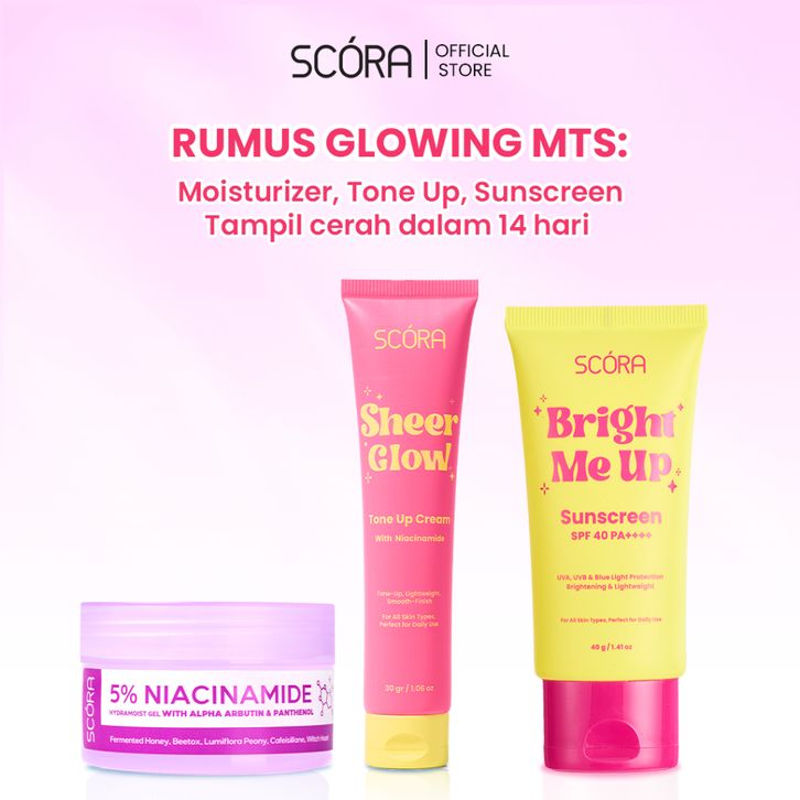 RUMUS GLOWING MTS: SCORA Bright Me Up Sunscreen 40 Gr + SCORA Sheer Glow Tone Up Cream 30 ml + SCORA Moisturizer 40ml