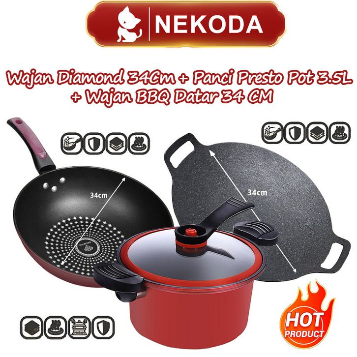 PROMO NEKODA Paket Triple Ekonomis Paket Panci Panggangan 34cm + Panci Presto Pot 3.5L + Wajan