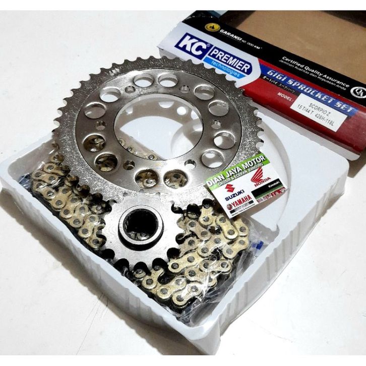 KC Premier Girset Yamaha SCORPIO Z 15T/44T 428H-118 Kc premier Type SSS warna 6old Chain tebal bajja asli kuat 2 ton