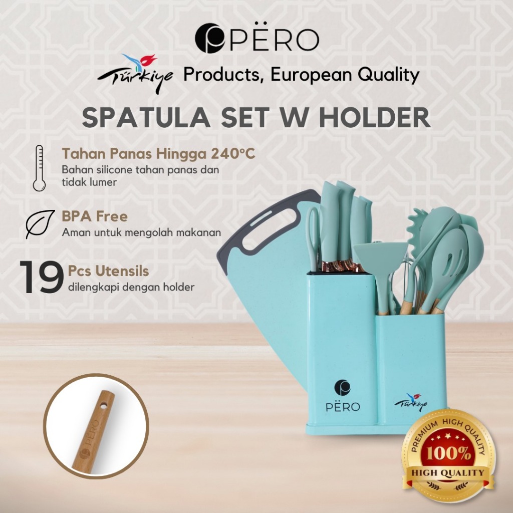 Peralatan Masak Pero Set of 19 Utensils Silicone Spatula & Knife with Holder Peralatan Masak 19 in 1 Spatula Pisau Set