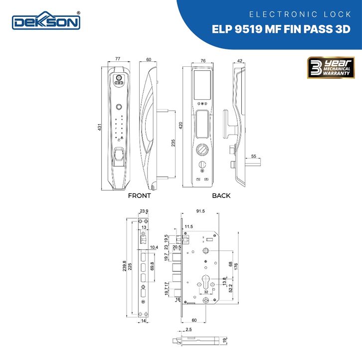 kunci pintu smart lock Dekkson Electronic Lock ELP 9519 MF FIN PASS 3D9rey
