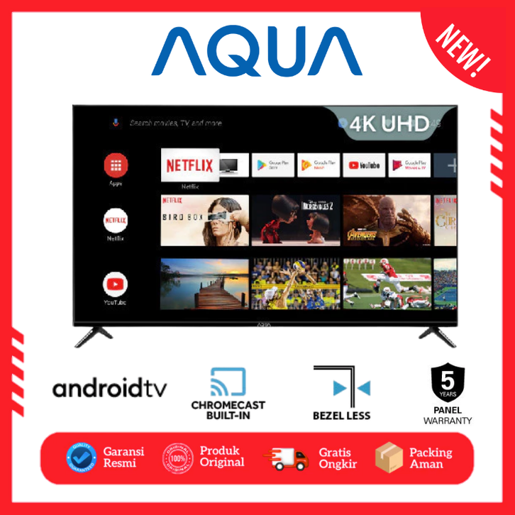 TV SMART AQUA 65 58 55 40 32 INCH TELEVISI DIGITAL TERFAVORIT ANDROID ELEKTRONIK 4K HDR GOOGLE BLUETOOTH BAZEL LESS