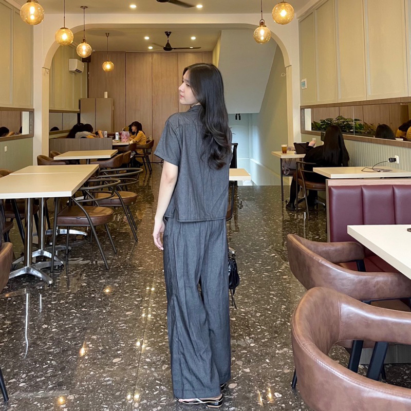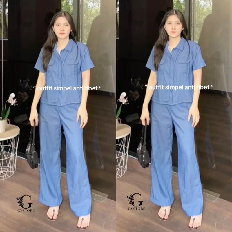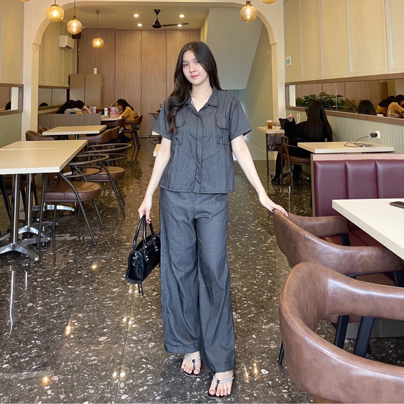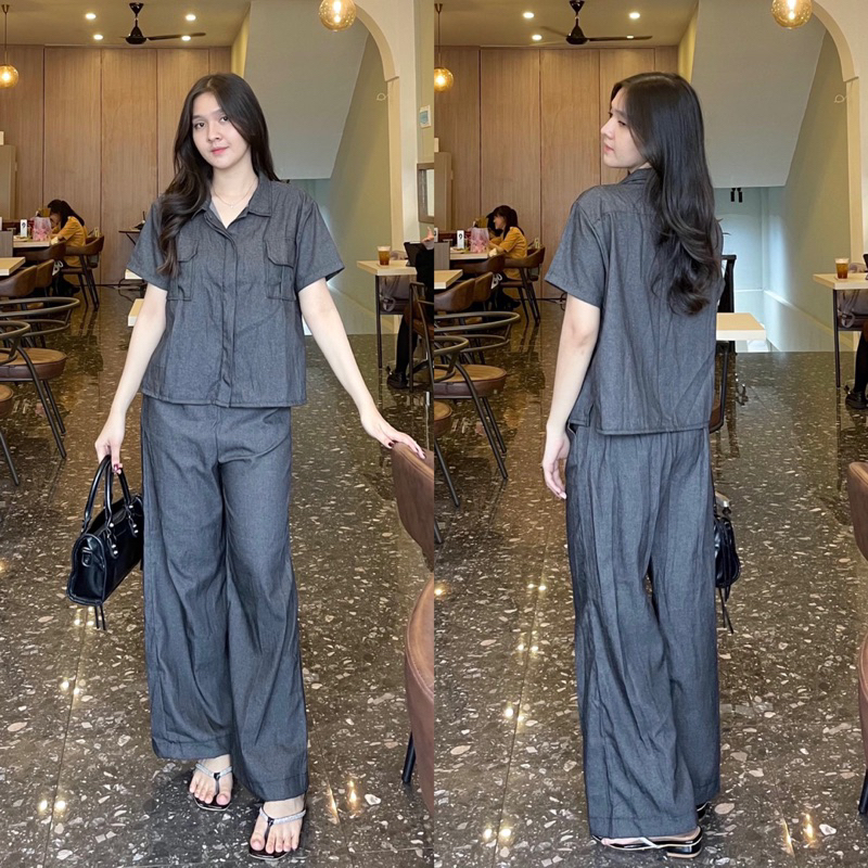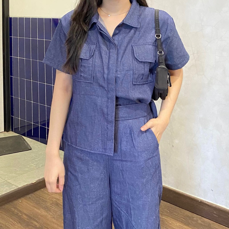 Gemma Denim One Set - Setelan Katun Denim Celana Panjang - Kemeja Set Wanita Kancing Casual Nyaman