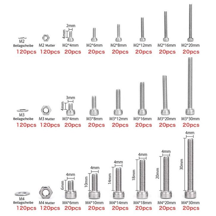 Promo Baut Mur Washer Ring Set Bulat Hex M2 M3 M4 Paket 1080 Pcs Kunci L Stainless SS 304 Hex Head Socket Screw Nut