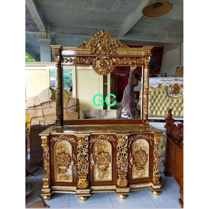 lemari kaca ruang tamu bufet pigura sima panjang 200cm kayu jati. (urwah al bariqi)