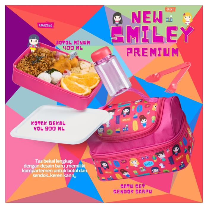 CPM new smiley premium set of 4 pcs pink /tas bekal makan tingkat anak dan terdapat stiker