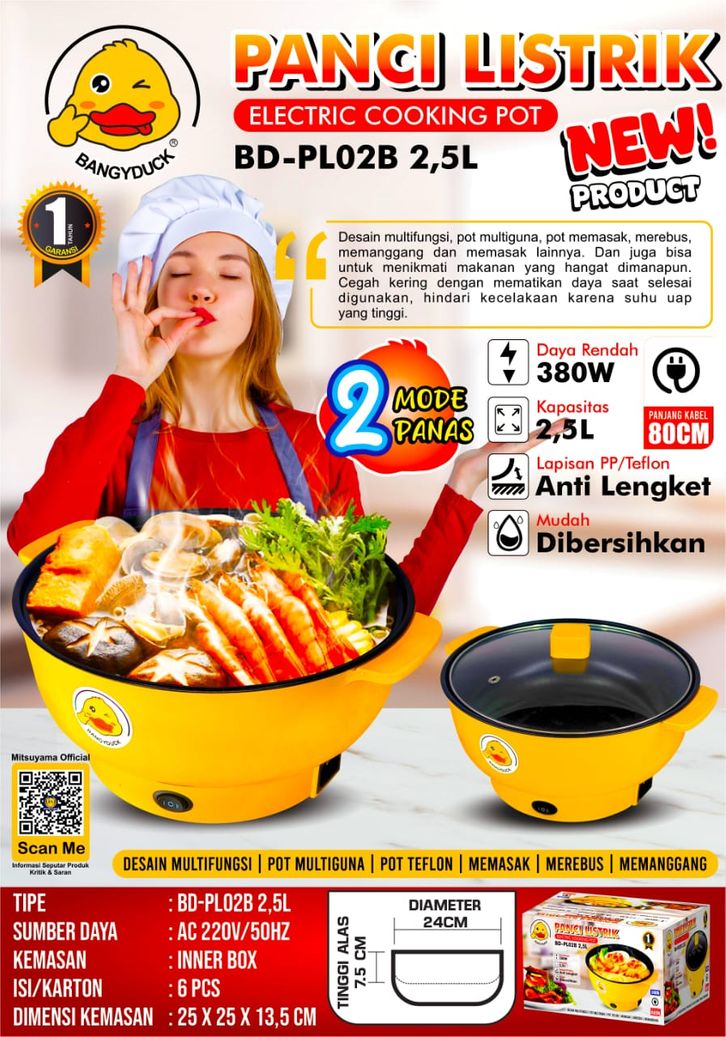 Panci Listrik 2 Liter / 2.5 Liter / 3 Liter Serba Guna Anti Lengket Cooking Pot BangyDuck BD-PL02A /B/ C Panci Elektrik