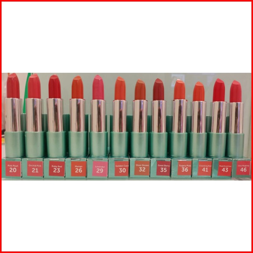 20 Pink Pearl, 21 Orchid Pink, 23 Ruby Red, 26 Mango, 29 Lavender, 30 Golden Coral, 32 Sheer Brown, 35 Great Berry, 36 Sugary Pink, 41 Charming Red, 43 Magnificent Red, 46 Chic Magenta