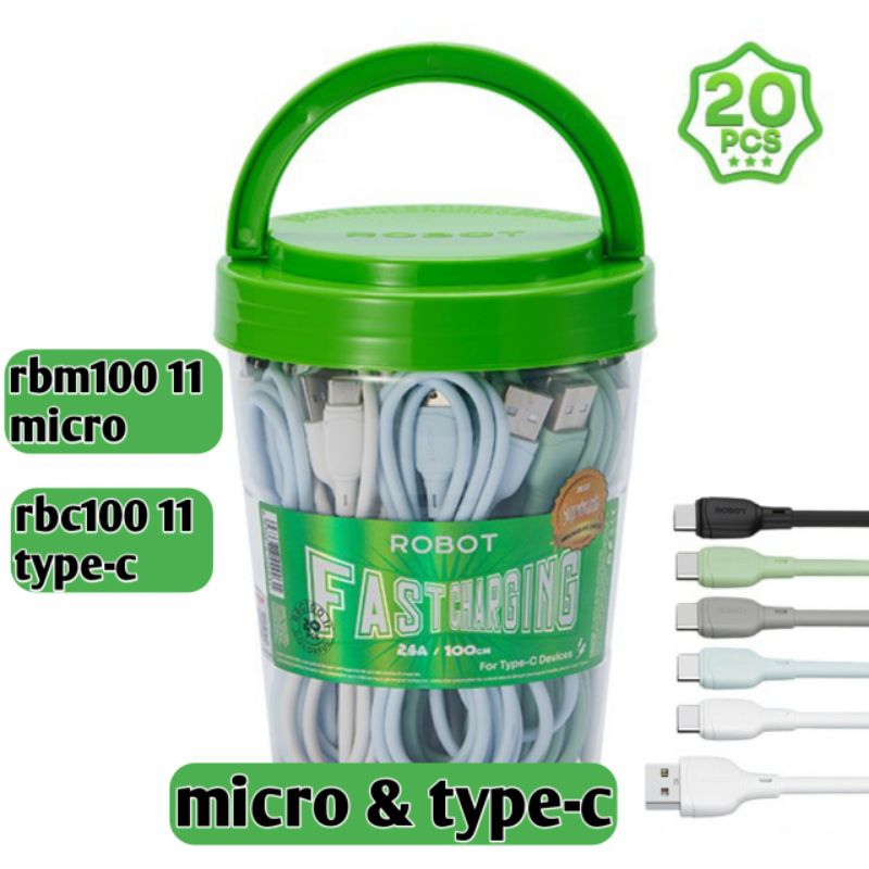 ( 1 TOPLES 20 PCS ) kabel Data ROBOT RBM-100 11 & RBM100S For Micro Usb Devices 2A Faing d306m/micro & d306c/type-c Usb