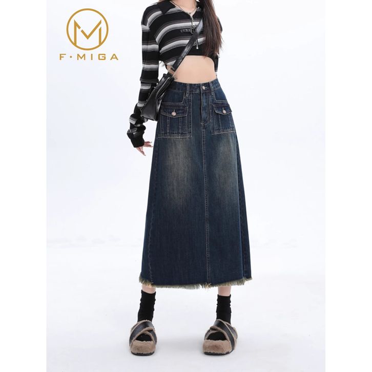 ROK JEANS WANITA/ROK JEANS WANITA KEKINIAN/ROK LEVIS WANITA/F·MIGA C46 High Waist Denim Rok Jeans Midi Wanita