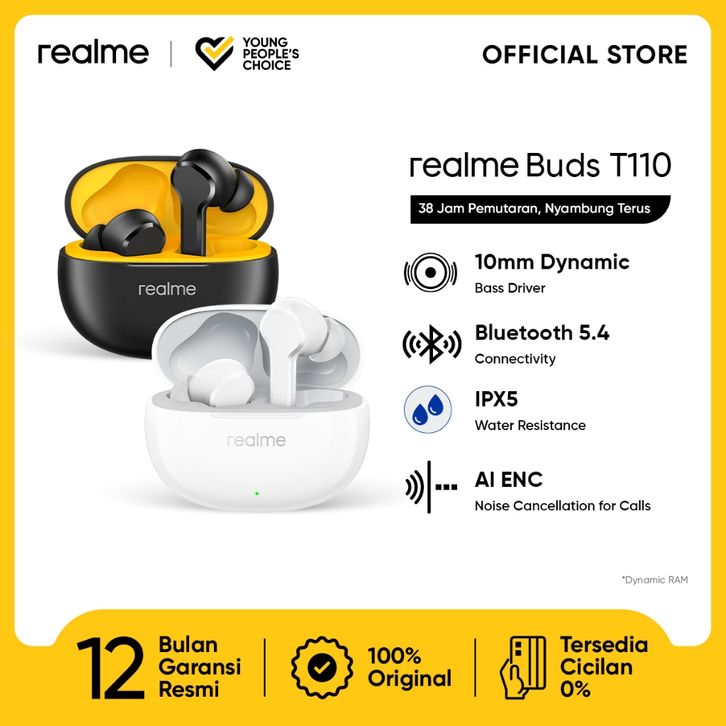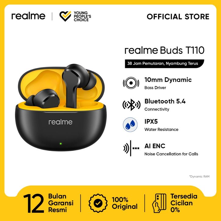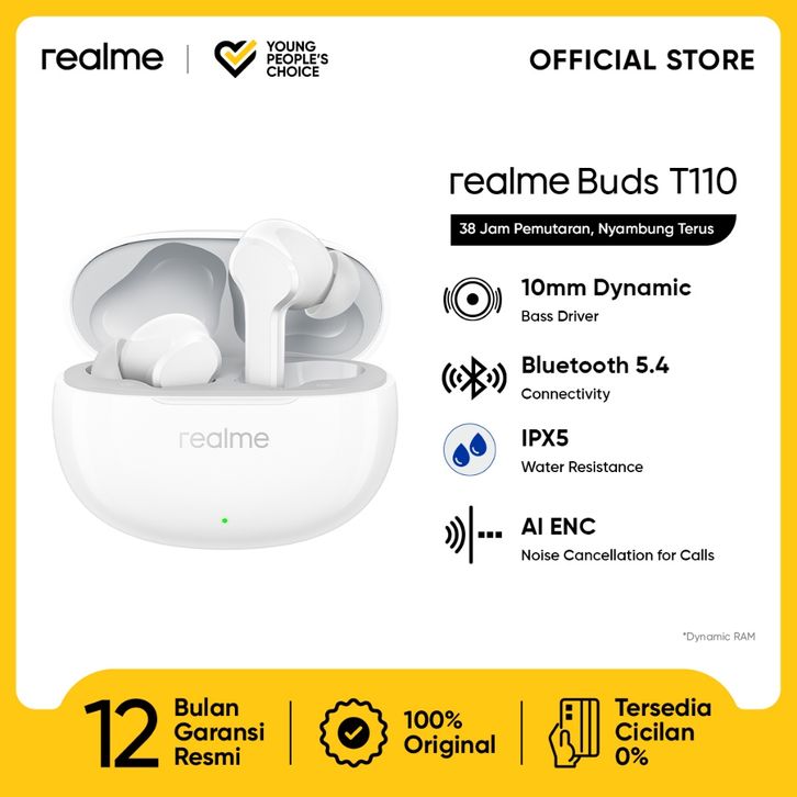 TWS REALME BUDS T110 10MM DYNAMIC BASS DRIVER BLUETOOTH 5.4 AI ENC NOISE CANCELLATION IPX5 WATER RESISTANCE EARPHONE