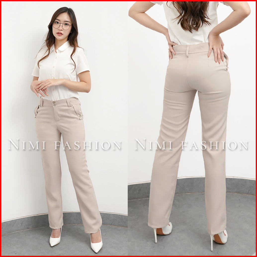 Nimi - Celana Kerja Kantor Reguler Formal Cream Pinggang Kancing Resleting Wanita