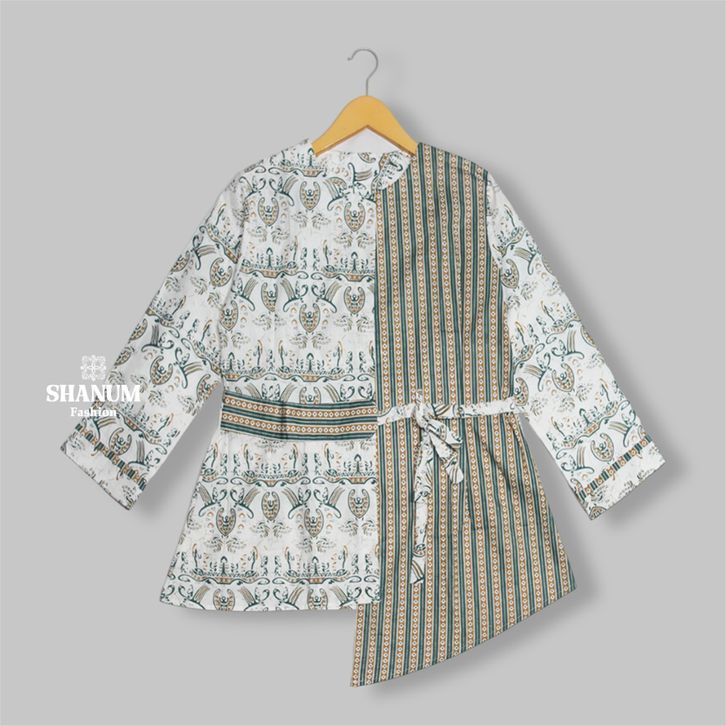 KEMEJA BATIK KERJA WANITA MODERN LENGAN 3/4 PANJANG MOTIF SONGKET TENUN BAHAN KATUN KOMBINASI POLOS TALI SERUT