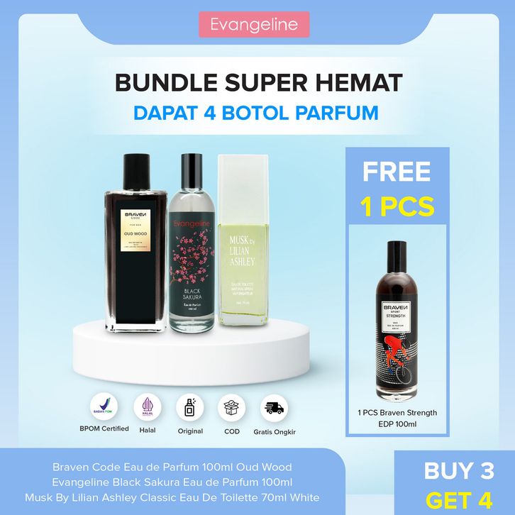 【BUY 3 GET 4】Bundle Super Hemat | Dapat 4 Botol Parfum Evangeline Black Sakura, Braven e Oud Wood, Musk By Lilian Ashle
