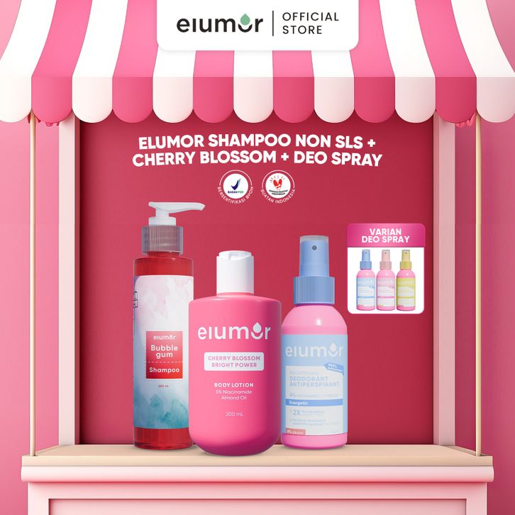 Paket Elumor Body Lotion Cherry Blossom 200ml + Elumor Shampoo Non SLS 200ml + Elumor Deodorant Antiperspirant 100ml