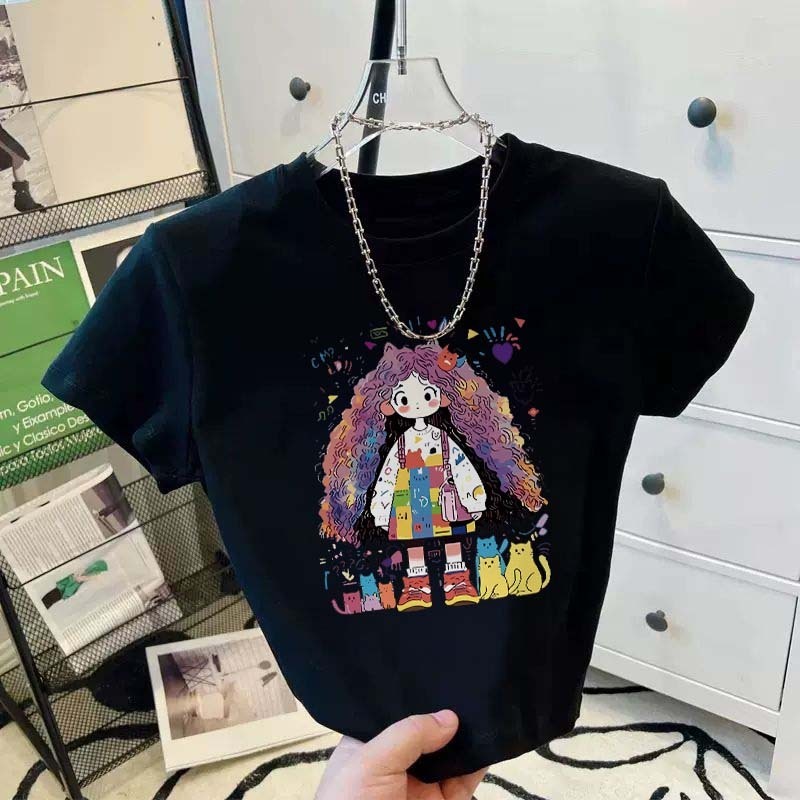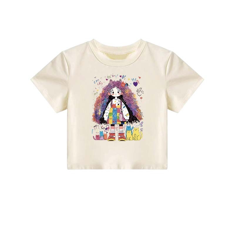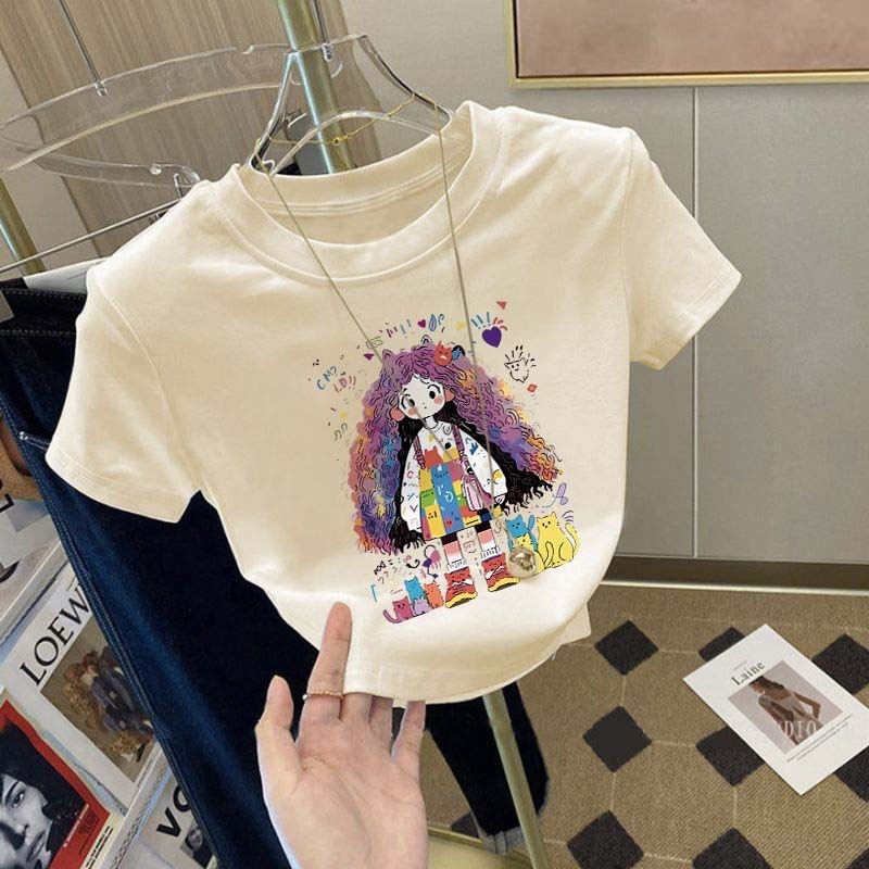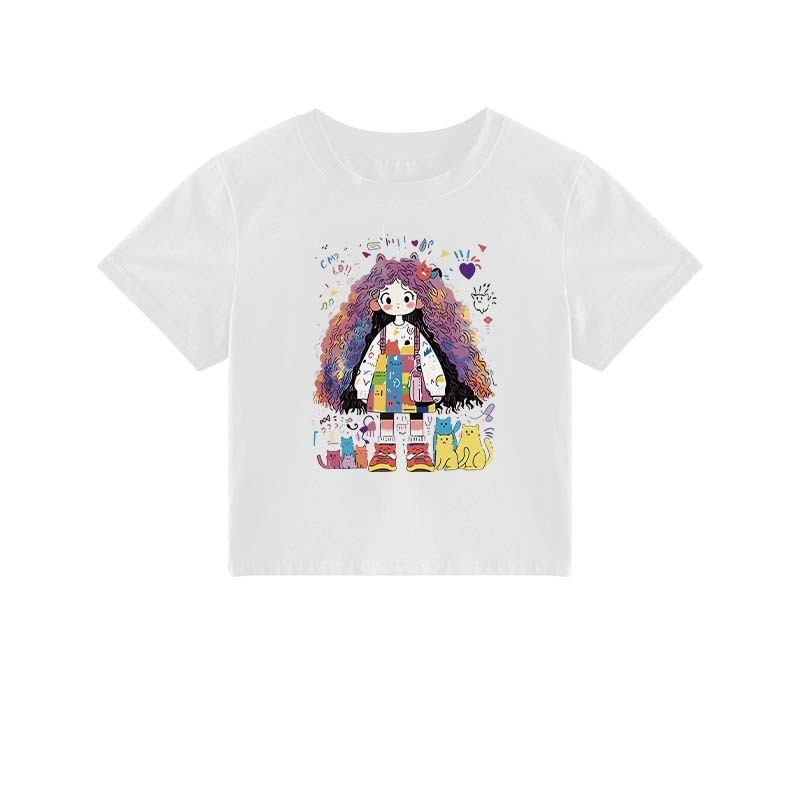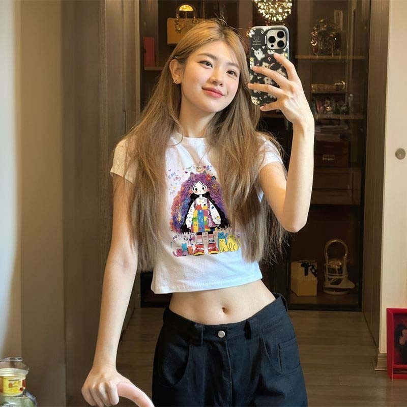 LuckyHive Crop Top Y2K Kaos Wanita Lengan Pendek Putih Colorful Little Girl Print Baju Crop Top Korea Style 100% Cotton