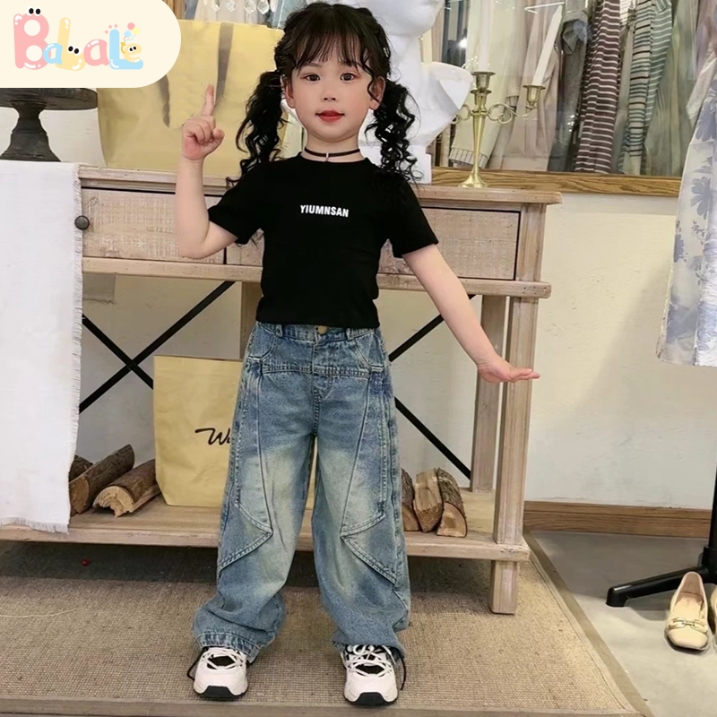 BALALE - SETELAN JEANS ANAK PEREMPUAN T-SIRT LENGAN PENDEK & CELANA JEANS KOREA COOL KANTUNG BESAR