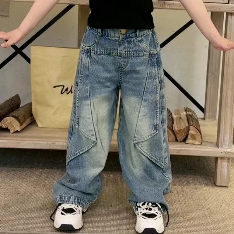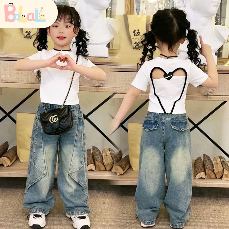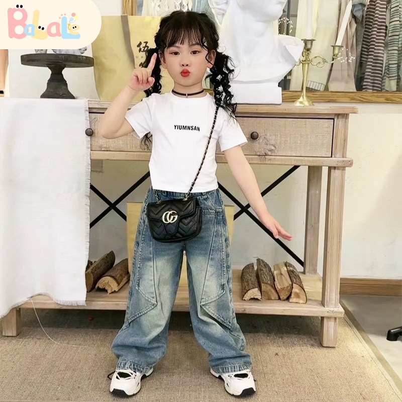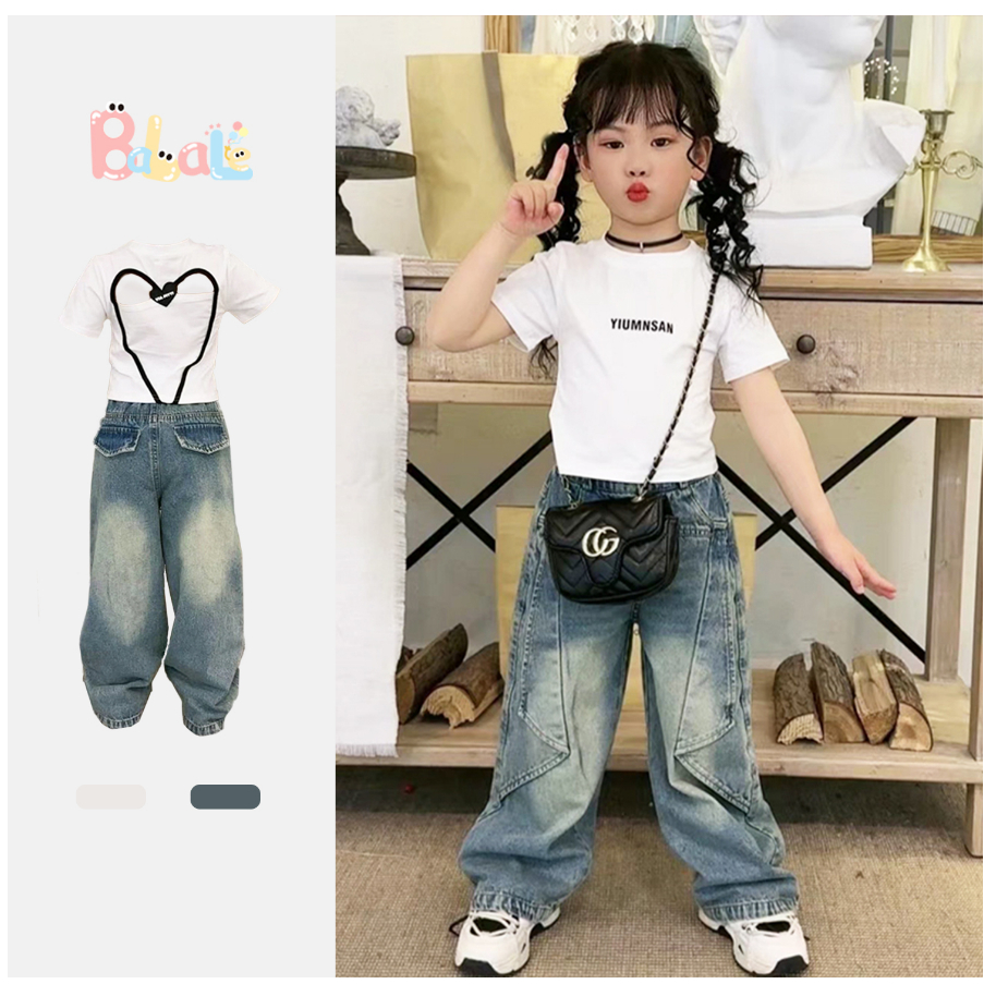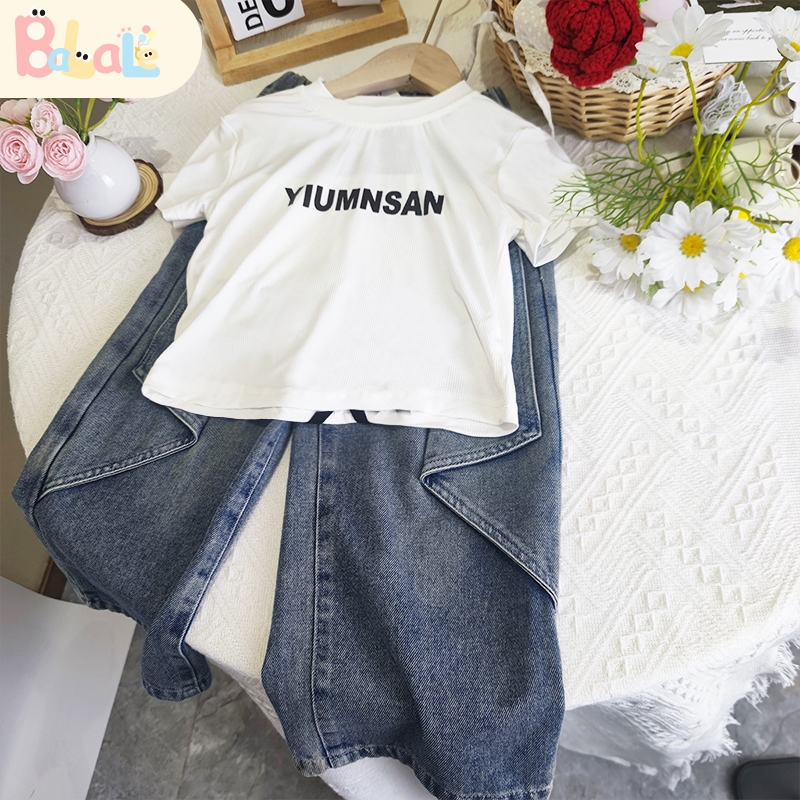 BALALE - SETELAN JEANS ANAK PEREMPUAN T-SIRT LENGAN PENDEK & CELANA JEANS KOREA COOL KANTUNG BESAR