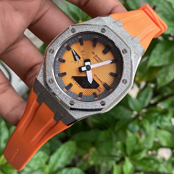 Casioak Gshock GA 2100 Orange Face Diamond Silver Rubber Orange 44mm