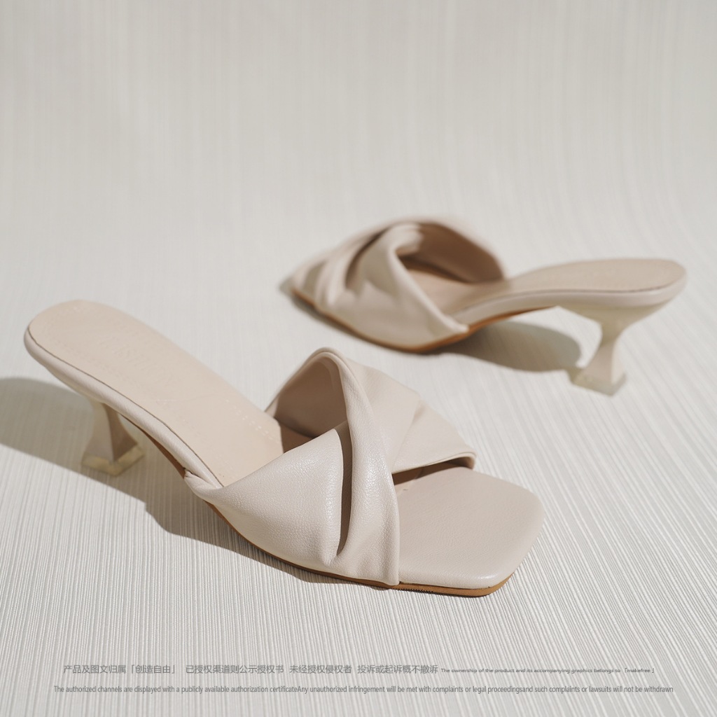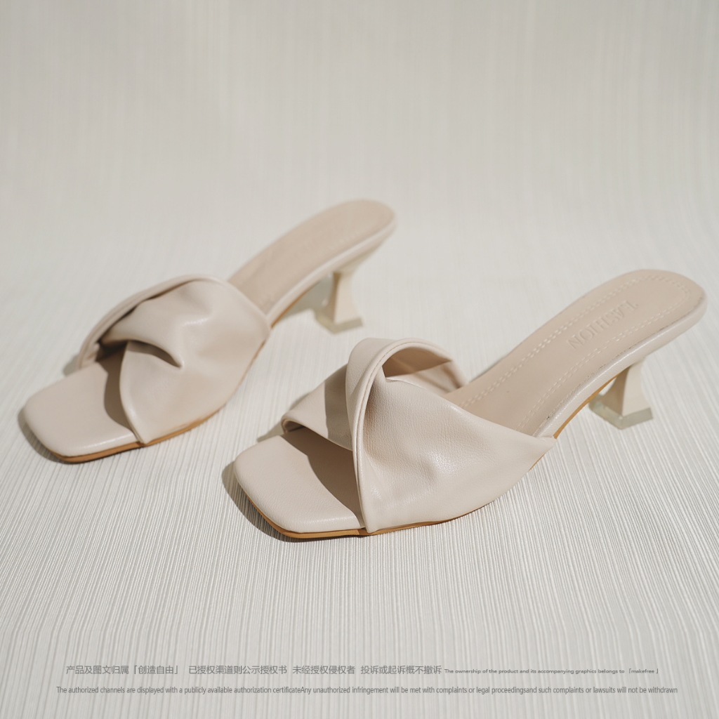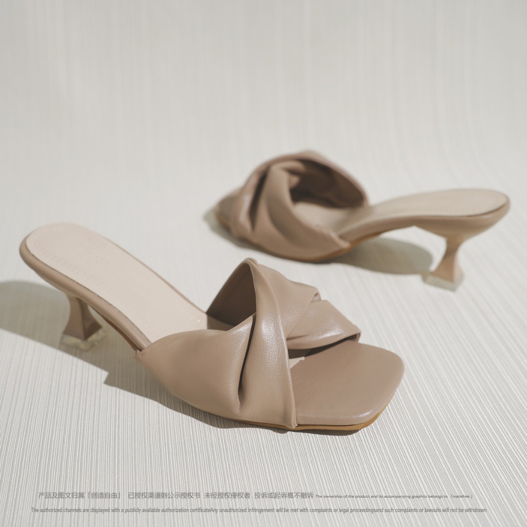 Sandal Heels Wanita Hak 3 cm Sandal Pakaian Luar Prancis Sederhana Sandal Moccasin Kaki Persegi
